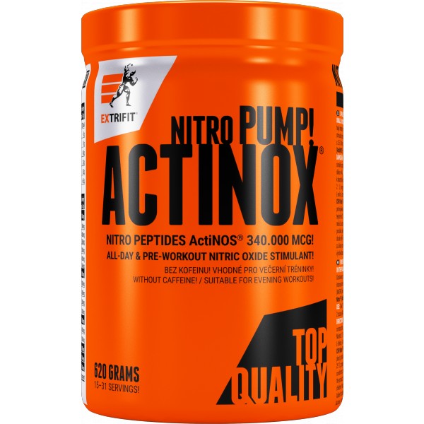 Produkt Actinox Nitro Peptides je určen pro všechny, kdo usilují o nárůst svalové hmoty. Hlavní složkou produktu je patentovaně chráněné ActiNOS (selektivní nitro peptidy a frakce modifikovaného, částečně hydrolyzovaného syrovátkového izolátu). Actinox Nitro Peptides působí jako celodenní stimulant produkce oxidu dusnatého (NO). Zvyšuje napumpování a prokrvení svalů, které přispívá k lepšímu využití živin ve svalových buňkách. Pro komplexní účinek obsahuje Actinox dále glutamin, větvené aminokyseliny (BCAA), citrulin, beta alanin a arginin ve formě arginin alfaketoglutarátu a arginin báze. Jako zdroj sacharidů obsahuje Actinox palatinózu (isomaltulózu). Actinox neobsahuje stimulační látky, je proto vhodný i pro večerní užívání, v dny tréninku i ve dny volna.