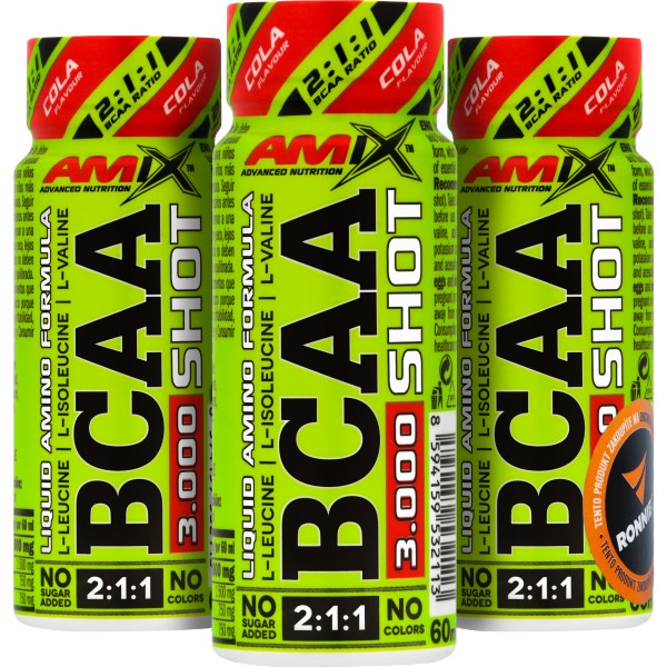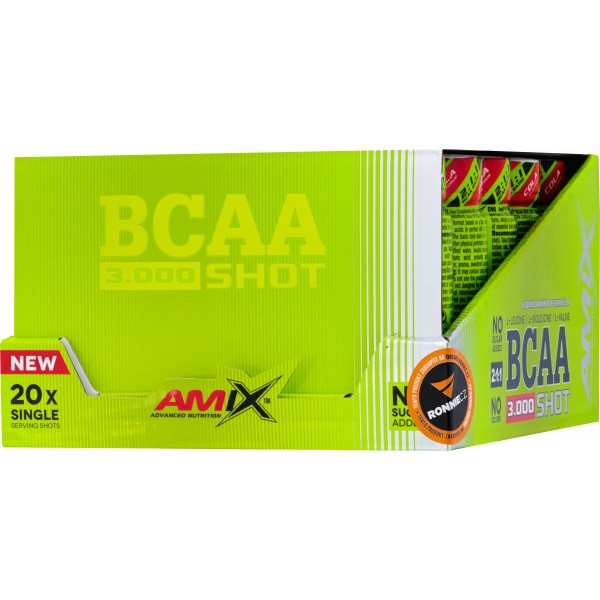 BCAA 3000 Shot je doplněk stravy v tekuté formě v kapesním balení ampulí s vysokým obsahem esenciálních aminokyselin s rozvětveným řetězcem BCAA v poměru 2:1:1 – L-leucin, L-isoleucin, L-valin. Bez přidaného cukru a barviv. BCAA jsou esenciální aminokyseliny, které naše tělo není schopno syntetizovat, proto musejí být dodávány zvenku ve formě potravy nebo doplňků stravy. Jsou potřebné pro udržení svalové tkáně během intenzivního cvičení, jsou součástí bílkovin, které podporují růst svalové hmoty. Díky jednotlivým ampulím si jej můžete snadno vzít kamkoli!