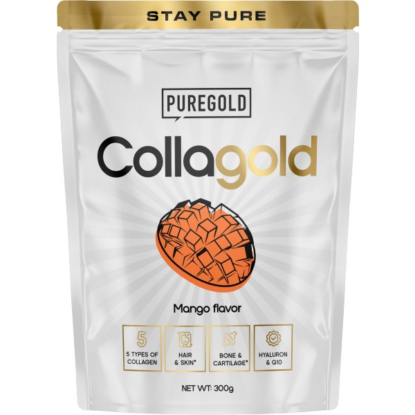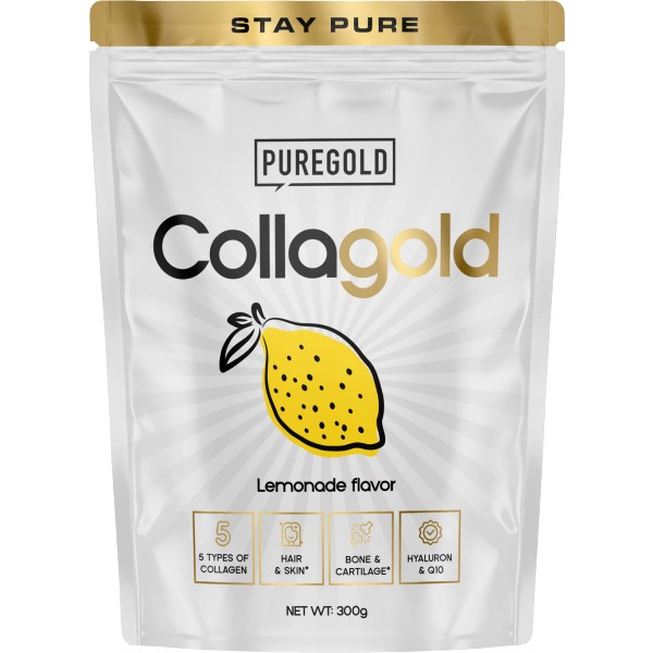 Hydrolyzovaný kolagen s kyselinou hyaluronovou a vitamínem C pro zdravou pleť, pevné vlasy, nehty a podporu kloubů. Pure Gold Collagold je ochucený nápoj obsahující hydrolyzovaný hovězí kolagen a hydrolyzovaný kolagen z mořských ryb, s přídavkem hydrolyzované kuřecí chrupavky, vitamínů, zinku a selenu. Pravidelným užíváním přispívá ke zpomalení stárnutí pokožky, zlepšuje její elasticitu a pomáhá regeneraci pohybového aparátu. Se sladidly.