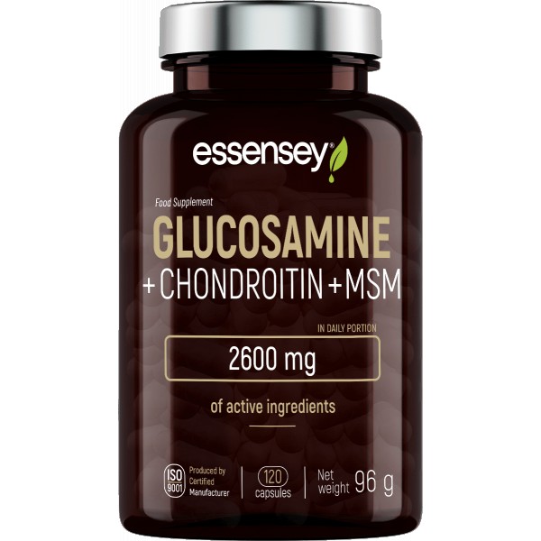 Produkt Glucosamine + Chondroitin + MSM značky Essensey (Trec Nutrition) nabízí hned tři oblíbené složky pro podporu zdraví Vašich kloubů – glukosamin sulfát, chondroitin sulfát a methysulfonylmethan (MSM). Všechny společně mají pozitivní vliv na klouby, vazy a šlachy, chrupavky a na stav pokožky. 2600 mg aktivních látek.