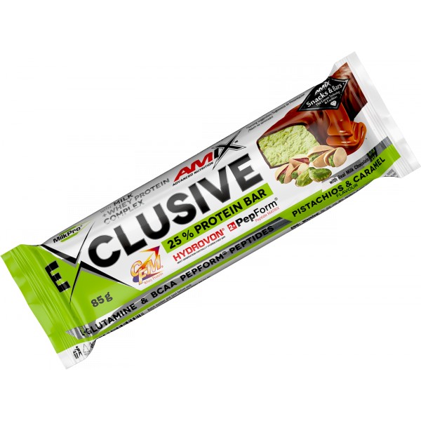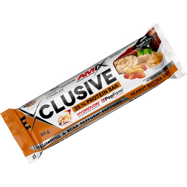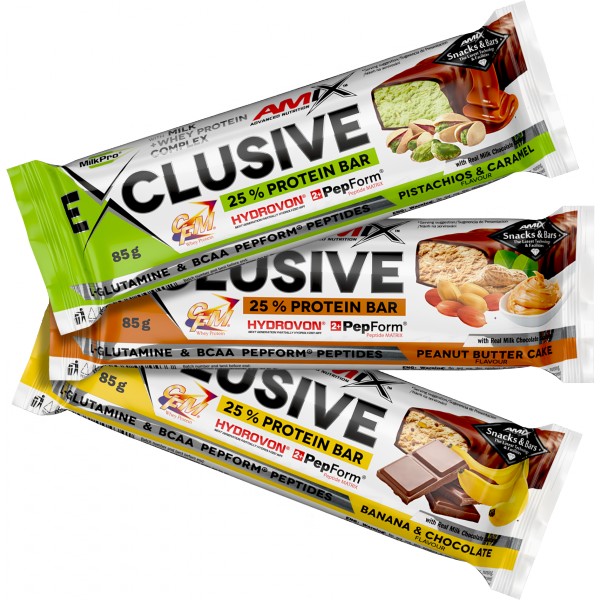 Exclusive Protein Bar je proteinová tyčinka s obsahem 25 – 28 % bílkovin. Nabízí nejkvalitnější zdroje bílkovin – směs MilkPro® Protein Blend, která obsahuje pouze patentované suroviny – CFM® syrovátkový bílkovinný izolát a koncentrát, částečně hydrolyzovaný syrovátkový izolát HydroVon®. Dále jsou přidány hydrolyzované peptidy (L-glutamin PepForm®, BCAA PepForm®).