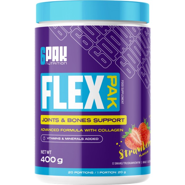 Flex Pak je pokročilá kloubní výživa, jejíž jednotlivé složky jsou důležité pro pohybový aparát. Je vhodná jak pro intenzivně trénující sportovce, tak pro nesportující populaci. Obsahuje hydrolyzovaný kolagen I. typu Solugel®, MSM, glukosamin sulfát, chondroitin sulfát, kyselinu hyaluronovou a prolin, dále pak vitamíny a minerály (vápník, hořčík, vitamín C a B6).