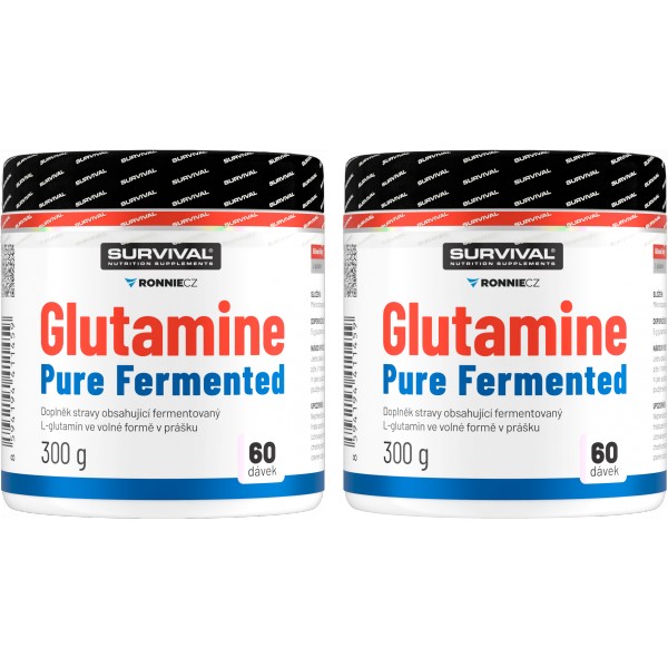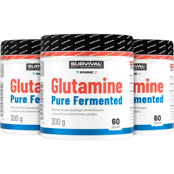 Glutamine Pure Fermented značky Survival nabízí 500gramové a/nebo 300gramové cenově velmi výhodné balení volné formy této semiesenciální aminokyseliny, kterou je zvlášť vhodné používat bezprostředně po tréninku a také večer před spaním. Lze používat v kombinaci s jinými doplňky sportovní výživy.