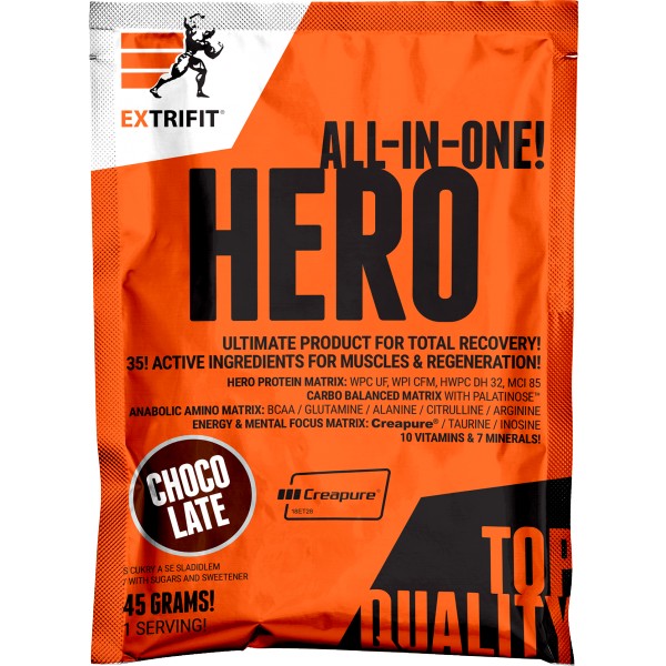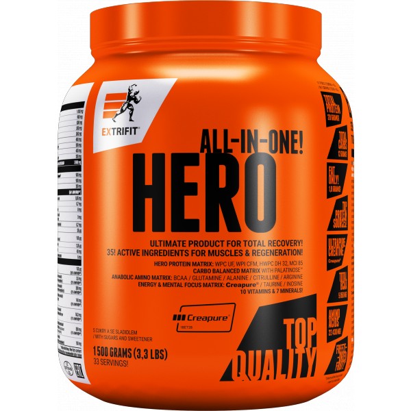 Okamžiky bezprostředně po tréninku jsou nejdůležitější chvílí celého dne, kdy tělo potřebuje velmi rychle stravitelné bílkoviny, kvalitní sacharidy a řadu dalších látek. Řada sportovců tuto potřebu řeší kombinací kvalitního proteinu a gaineru, většina ale sahá po potréninkových suplementech „vše v jednom“. A právě takovým je i Hero, které obsahuje 37 účinných látek! Klíčových je 6 druhů bílkovin (včetně ultra rychlého syrovátkového hydrolyzátu DH32), 4 zdroje sacharidů (s různě rychlým postupným vstřebáváním), matrix 21 aminokyselin, značkový kreatin Creapure, komplex vitamínů a minerálů. Vše, co svaly potřebují po tréninku, aby mohly rychleji regenerovat, růst a sílit. Přečtěte si vše o složení v popisu níže!