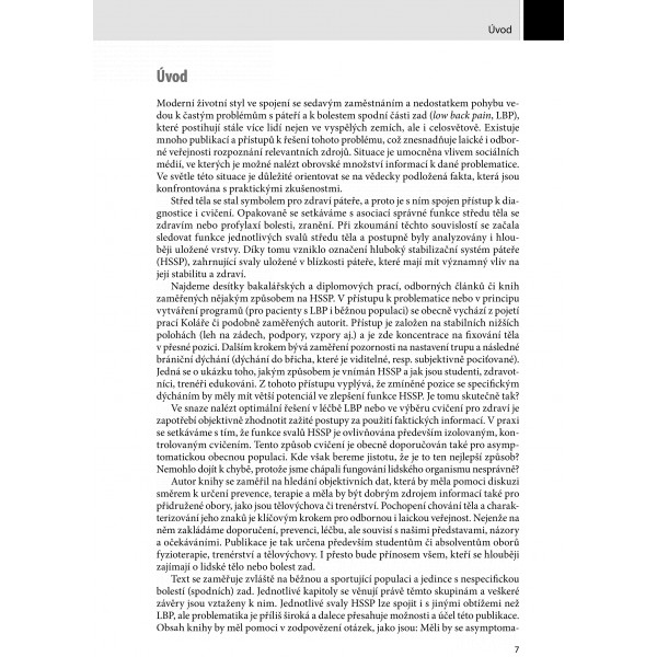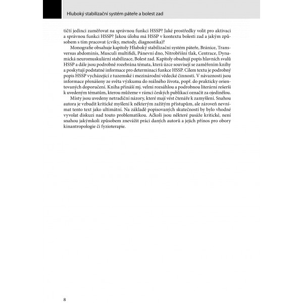 Kniha se zabývá aktuálním problémem bolesti zad, který je spojen se západním způsobem života. Zaměřuje se na hluboký stabilizační systém páteře (HSSP) a jeho vztah k prevenci a léčbě bolesti zad. Autor přináší objektivní pohled na problematiku a spojuje vědecké poznatky s praktickými aplikacemi. Kniha obsahuje detailní popisy jednotlivých svalů a zkoumá jejich roli v kontextu zdraví páteře. Pozornost je zaměřena na zdravé jedince, osoby s bolestí zad a sportovce.