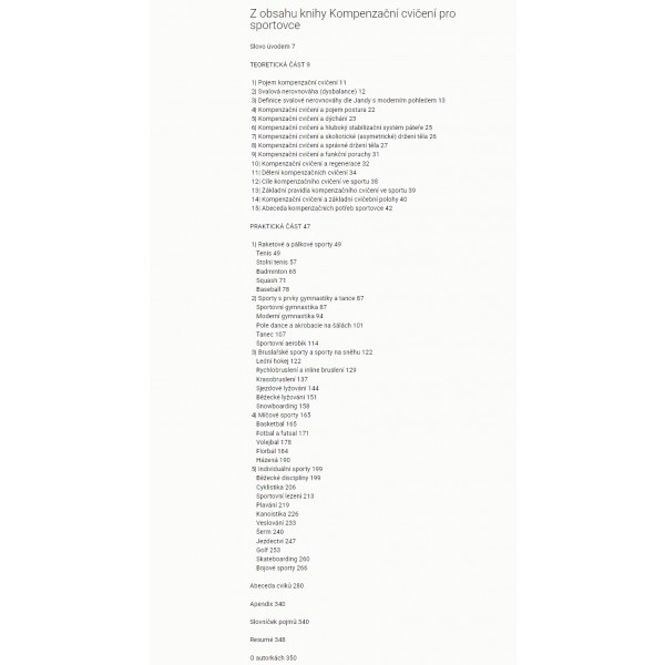Kniha obsahuje více než 30 kapitol věnovaných rozličným sportovním odvětvím, v nichž jsou popsány zatížené svalové skupiny, typická zranění a návrh vzorové kompenzační jednotky pro danou disciplínu. Obdobné kompenzační jednotky si mohou sportovci následně tvořit s pomocí doporučených částí Abecedy cviků, která obsahuje srozumitelný a praktický přehled více než 120 kompenzačních cviků včetně jejich detailního popisu, upozornění, co je třeba si při cviku hlídat, a fotografií správného provedení.
