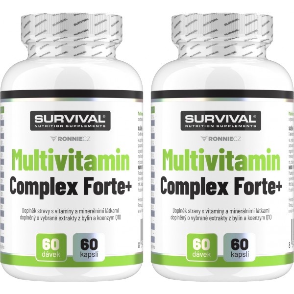 V případě, že pravidelně užíváte multivitamínový přípravek, měli byste vědět, že nárazově podané velké množství vitamínů a minerálních látek nedokáže lidský organismus vstřebat a přebytek prostě a jednoduše vyloučí – tzn. užíváte-li doplňky s obsahem megadávek těchto látek, Vaše tělo s velkou pravděpodobností velkou část Vaší (mnohdy finančně nezanedbatelné) investice do zdraví vůbec nevyužije. Proto Survival vytvořil Multivitamin Complex Forte – dokonale vyvážený suplement, který v každé kapsli obsahuje přesně 100 % doporučené denní dávky důležitých vitamínů a vybraných minerálních látek významných (nejen) pro sportovce. Každá kapsle Multivitamin Complex Forte tak umožní dodat Vašemu tělu jednak to, co skutečně potřebuje, a zároveň v dávkách, jaké má šanci reálně využít. Pocítíte-li přesto (např. kvůli náročné práci, nachlazení a podobně) potřebu dávkování zvýšit, i v případě použití více kapslí v různých denních dobách dáte tělu (právě s ohledem na použití v jiný čas) dostatek prostoru přijaté látky využít. Celé využitelnosti také přispívají obsažené minerální látky ve vysoce využitelných chelátových formách!