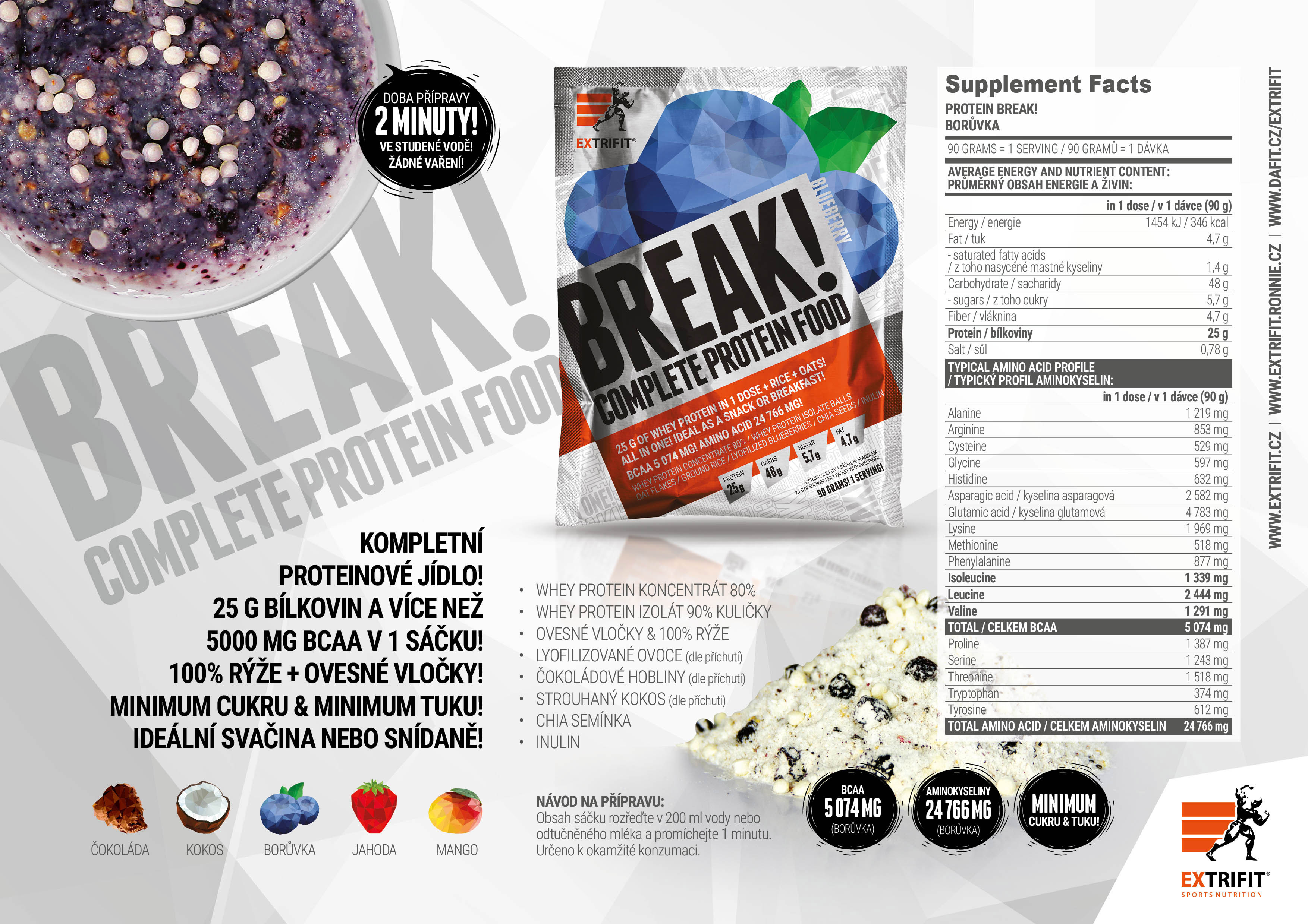 Už nemusíte vymýšlet žádná speciální proteinová jídla, trápit se s vařením a zdržovat se složitou přípravou nutričně vyvážených jídel. Nyní máte Protein Break!, chuťově i nutričně vyvážené hotové jídlo v mnoha chutích. Stačí jen vysypat do misky, zamíchat a ihned můžete jíst. V každé dávce máte bílkoviny i komplexní sacharidy.