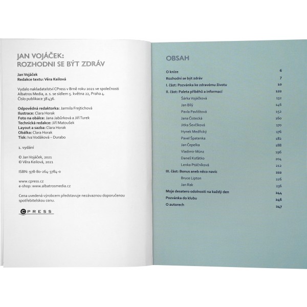 MUDr. Jan Vojáček, autor velúspěšného bestselleru Umění být zdráv, nabízí pokračování na naší cestě k uzdravení těla a mysli. V nové knize nazvané Jan Vojáček: Rozhodni se být zdráv je nám průvodcem na ne vždy jednoduché pouti ke znovunalezení umění naslouchat svému tělu a také odvahy k plnému a radostnému životu. Spolu s ním nás na této cestě bude doprovázet i řada dalších osobností, které Jana Vojáčka ovlivnily – přečteme si řadu nesmírně zajímavých informací například z oblasti homeopatie, non toxic životního stylu, budování systemických konstelací, žití v přítomném okamžiku či naturopatie. Dozvíme se, jak nás ovlivňuje světlo, jak zvládat agresi a hněv, co je to egodiagram, jak na nás působí vztahy s nejbližšími či jak zharmonizovat svůj mozek. Na závěr, jako bonus, pak čtenář najde rozhovory s průkopníkem epigenetiky Brucem Liptonem a kvantovým fyzikem Janem Rakem.