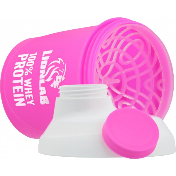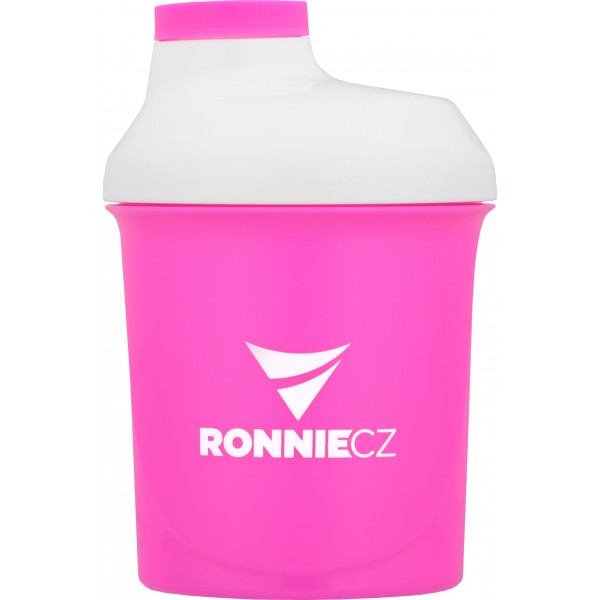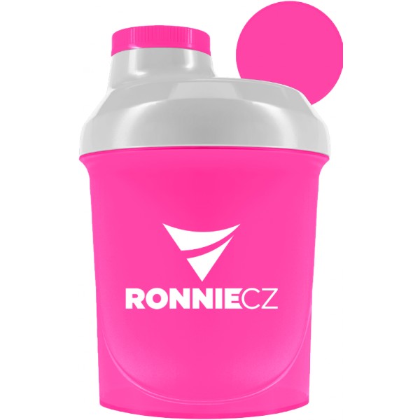 Šejkr Lionlab a Ronnie.cz má růžovou barvu s bílým uzávěrem a růžovým malým šroubovacím víčkem. Na šejkru je na jedné straně logo Lionlab a nápis 100% Whey Protein, na druhé straně je logo Ronnie.cz, oboje v bílém provedení. Po straně jsou rysky v ml pro odměření. Objem šejkru je 300 ml. Šejkr obsahuje mřížku pro lepší rozmíchání nápoje.