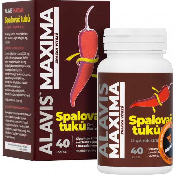Alavis Maxima Spalovač tuků je sestaven ze tří hlavních složek, které Vám pomohou k urychlení spalování kalorií, udržení hmotnosti pod kontrolou, nezatíží žaludek a zvýší výkon. Obsahuje extrakt z papriky s kapsaicinem, který přispívá nejen ke kontrole tělesné hmotnosti, dále kofein pomáhající zlepšit soustředění, bdělost a pozornost (při příjmu 75 mg/dávku) a osvědčenou látku L-karnitin. Spalovače tuků jsou doplňky stravy ideální nejen pro hubnutí, ale i zvýšení fyzické kondice či výkonu. Jsou užívány jak běžnou populací, tak profesionálními sportovci. Obsahují látky, ke kterým patří např. L-karnitin, kapsaicin, kofein či jiné.