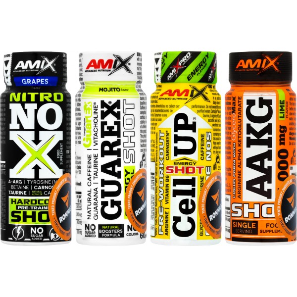 Nabité předtréninkové produkty! Co obsahují? Guarex® Energy & Mental Shot – excelentní dávka energie založená na vysokém obsahu extraktu z guarany, VitaCholine® (cholin bitartrát), taurinu a suroviny ActiveTR™, neboli přírodním enkapsulovaném kofeinu. CellUp Shot – patentovaná, vysoce koncentrovaná forma práškového glycerolu a křemíku (GlyceroMax®), beta-alanin (CarnoSyn®), taurin, L-arginin HCl, N-acetyl L-tyrosin, kofein a vitamín B6 s vitamínem C. NitroNoX Shot – L-arginin AKG, CarnoSyn® beta alanin, enkapsulovaný kofein, tyrosin (NALT), taurin, L-citrulin, betain, glukuronolakton, histidin a vitamín B6. AAKG 4000 mg Shot – L-arginin alfa ketoglutarát v kombinaci s glycerolem GlyceroMax®.
