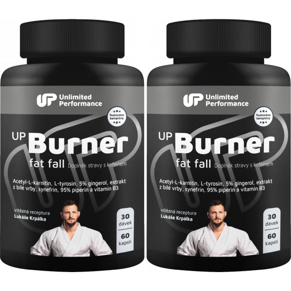 Nekompromisní spalovač tuků. UP Burner Fat Fall je doplněk stravy s acetyl-L-karnitinem, L-tyrosinem, kofeinem, extraktem ze zázvoru a z bílé vrby, vitamínem B3, extraktem z pomerančovníku hořkého a černého pepře. S Vaším tréninkem není lepší kombinace na zbavení se přebytečných tukových zásob a snížení hmotnosti. UP Burner Fat Fall je a má být součástí finální přípravy nebo nejtěžších tréninků v jakémkoliv sportu. Na vývoji produktu se podílel olympijský vítěz Lukáš Krpálek, který ho sám ve své sportovní přípravě používá.