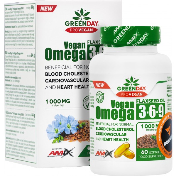 Omega 3-6-9 mastné kyseliny řady GreenDay ProVegan jsou příznivé pro normální hladinu cholesterolu v krvi, kardiovaskulární systém a zdravé srdce. Měkká kapsle plná organického lněného oleje bohatého na omega 3, omega 6 a omega 9 mastné kyseliny. Je dobře polykatelná a je vhodná pro vegany a vegetariány.