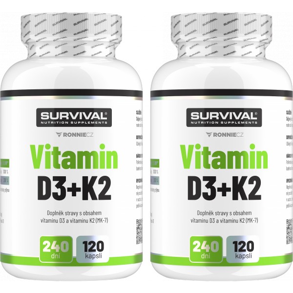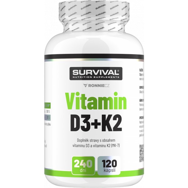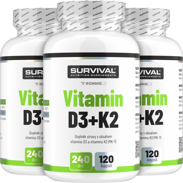 Vitamin D3+K2 nabízí velmi silnou a synergicky působící kombinaci vitamínu D3 a vitamínu K2 MK-7. Tato netradiční forma vitamínu K působí v těle třikrát déle v porovnání s ostatními formami. Dokonalá vstřebatelnost účinných látek díky přidanému sójovému lecitinu pak jen podtrhuje maximální kvalitu produktu. Vysoký obsah vitamínů a optimalizované dávkování navíc zajistí, že jedno balení Vám vystačí na celých 240 dní!