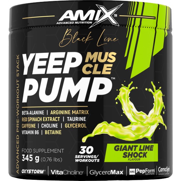Yeep Pump z řady Black Line je revoluční superkoncentrovaný předtréninkový doplněk určený pro nejnáročnější sportovce, aby posunuli své intenzivní tréninky na další úroveň. Tento osvěžující a chutný nápoj je založen na dávce 3 g CarnoSyn® beta-alaninu a obohacen o argininový komplex, taurin, L-lysin, glycerin GlyceroMax™, VitaCholine®, extrakt z červeného špenátu Oxystorm®, betain, kofein a vitamín B6. Vitamín B6 pomáhá snižovat únavu a vyčerpání, zatímco kofein přispívá ke zvýšení odolnosti, pomáhá zlepšit koncentraci a bdělost.